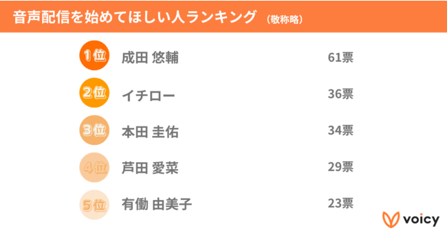 音声配信を始めてほしい人は、1位「成田悠輔」、2位「イチロー」、3位「本田圭佑」。残っていてほしかった声1位は「坂本龍馬」。