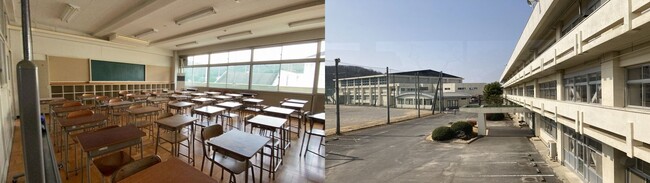 桐生南高校の教室(左)、校庭と校舎(右)=2021年撮影