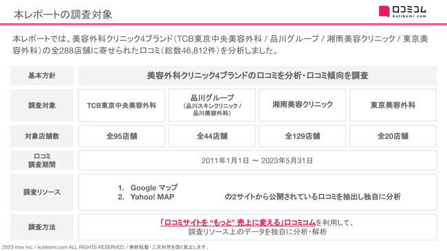 今回は、美容外科クリニック4ブランド(TCB東京中央美容外科 / 品川グループ / 湘南美容クリニック / 東京美容外科))の口コミ(総数46,812件)を分析しました。