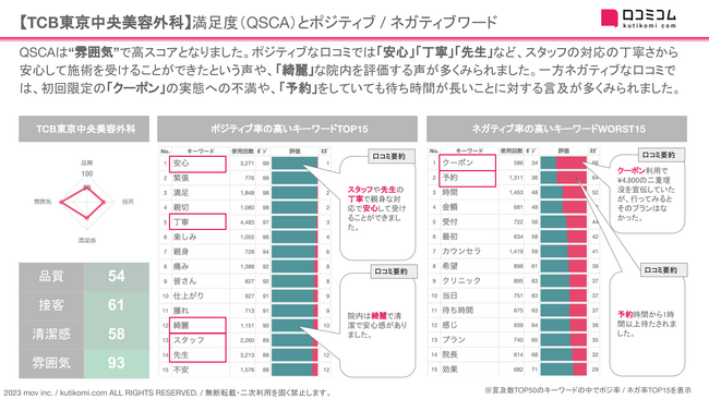 今回は、このAI解析を用いて【TCB東京中央美容外科】 のQSCA・ポジ / ネガキーワードを確認しました。