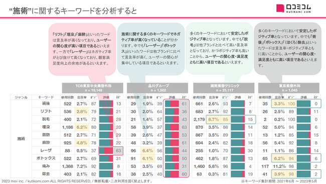 東京美容外科では、多くのキーワードにおいて安定したポジティブ率となっています。中でも「術後」「ボトックス」「(ほくろ)除去」といったワードは言及率・ポジティブ率ともに高いことから、ユーザーの関心度・満足度ともに高い項目であるといえます。