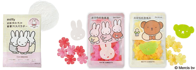 ミッフィーやくまのボリスとお花の形のバスコンフェッティ。ひらひらお風呂に散らして楽しんだり、勢いよくお湯を注げば泡風呂が楽しめます。