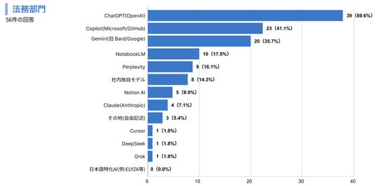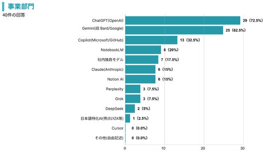 利用している生成AIツールについては、「ChatGPT」が最多で、法務部門69.6%、事業部門72.5%でした。次いで、法務部門では「Copilot」、事業部門では「Gemini(旧Bard)」が多く利用されていることが明らかになりました。