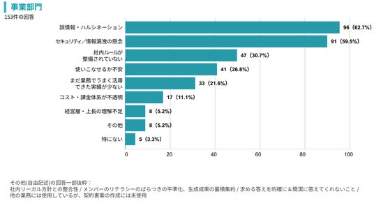 - 活用の障壁として両部門とも、「誤情報(ハルシネーション)」「セキュリティ・情報漏洩」との回答が多く見られた。また、「社内ルールが整備されていない」「使いこなせるか不安」も比較的多く挙げられた。