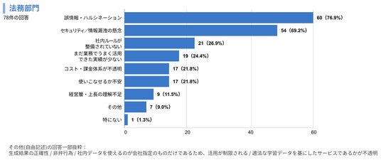 活用にあたっての主な懸念として、両部門共通で「誤情報(ハルシネーション)」「セキュリティ・情報漏洩」に関する回答が多く挙げられました。さらに、「社内ルールが整備されていない」「使いこなせるか不安」などの回答も寄せられました。