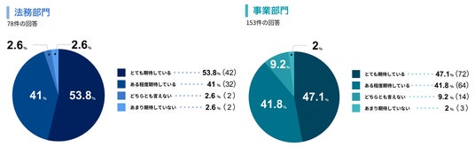 - 法務・事業部門ともに、生成AIへの期待は8割以上(法務部門:94.8%、事業部門:88.9%)