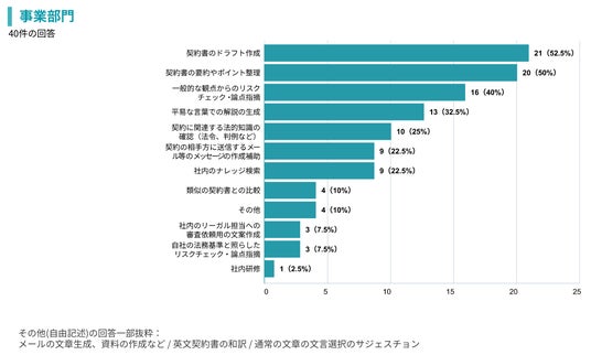 具体的な活用領域として、法務部門では「法的リサーチ」「メール・社内文書の下書き」「法律相談前の事前情報収集」、事業部門では「契約書のドラフト作成」「契約書の要約やポイント整理」「一般的な観点からのリスクチェック・論点指摘」などが確認されました。