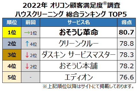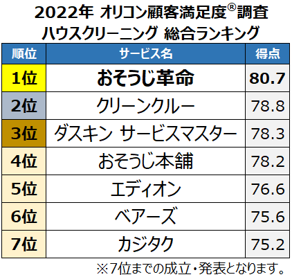 2022年 オリコン顧客満足度(R)調査 『ハウスクリーニング』ランキング