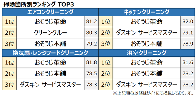 掃除箇所別ランキングでは、「エアコンクリーニング」「キッチンクリーニング」「換気扇・レンジフードクリーニング」「浴室クリーニング」の4部門を発表。