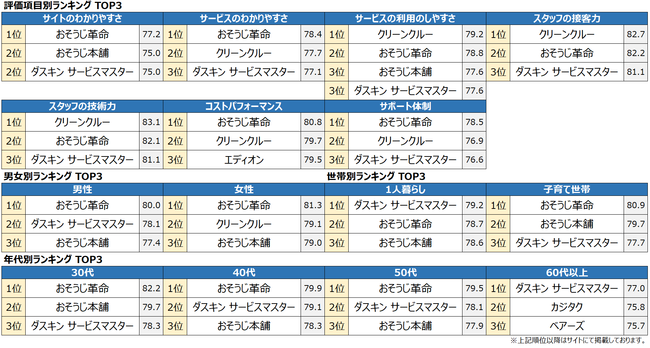また総合3位の【ダスキン サービスマスター(株式会社ダスキン 本社:大阪府吹田市)】は、年代別「60代以上」、世帯別「1人暮らし」で1位を獲得しました。