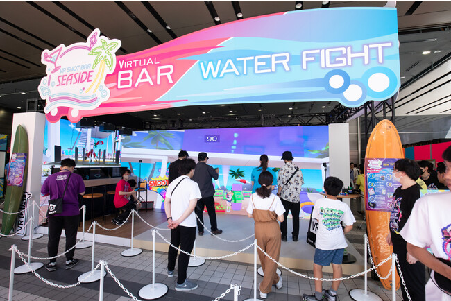 ショットバーの横の大型モニターでは、VR空間に映るアバターとシューティング対戦ができ、こちらもたくさんの方にご参加いただき、リアル側はもちろんバーチャル側の参加者からも好評でした。