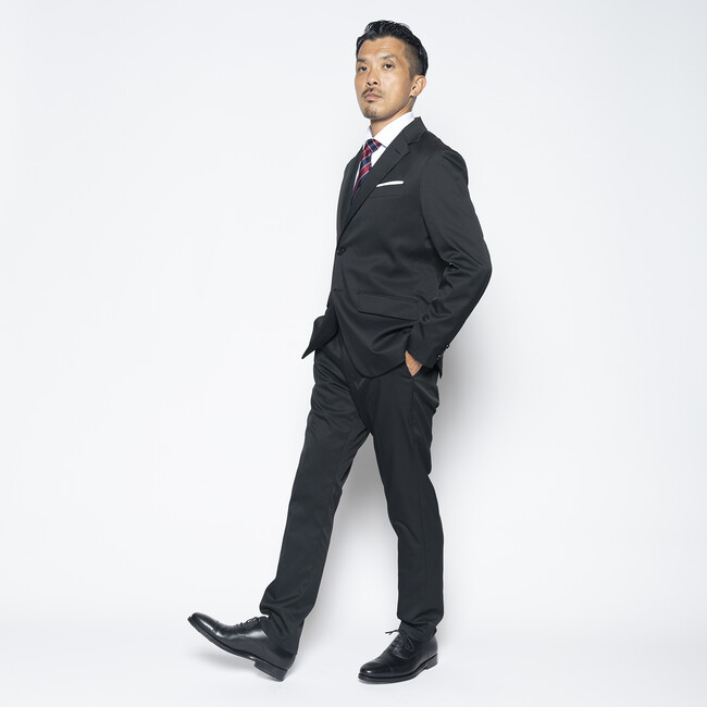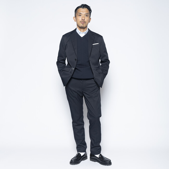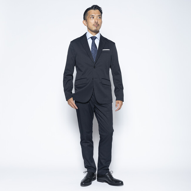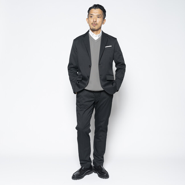 特徴:生地はストレッチ性、速乾・撥水、水洗い可、イージーケアなどの高機能性を備える自社オリジナル素材「ultimex」を使用。裏地には身体から発生する遠赤外線を吸収して蓄熱する特殊な素材を使用することで、優れた保温性を誇ります。さらに、裏地も高ストレッチで軽量なので、全体的な着心地が損なわれない仕上がりに。胸ポケットは、出し入れ可能なフェイクチーフ付き。左内ポケットにはファスナーがついており、スマホや名刺入れ、パスポートなどが収納可能。パンツのウエストは背面ゴムなので、体験の変化にも合わせられる仕様に。右サイドポケット横の目立ちにくいコンシールファスナーを使用したポケットには、落としたくないスマホやワイヤレスイヤフォンなどの小物が収納できます。センタープレスを入れることで、洗練された雰囲気を演出。