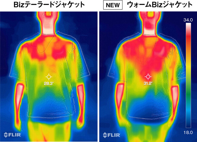 自社で行ったサーモカメラを利用した実験では、同じ条件の下、自社の従来品と本商品を着用し比較すると、後者着用時で表面最高温度が3度上昇することが判明しました(上画像参照)。