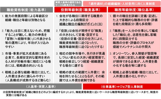 - 一方、本来ジョブ型であるはずの役割等級制度を、年功的な人事秩序を維持しながらメンバーシップ型の制度として運用する企業が少なくありません