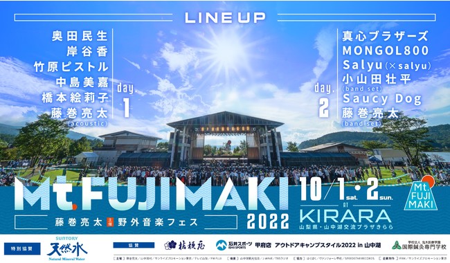 藤巻亮太がオーガナイザーを務め、自身の地元である山梨県の山中湖交流プラザ きららで、2022年10月1日(土)、2日(日)に開催する野外音楽フェス「Mt.FUJIMAKI 2022」の全出演者を発表しました。