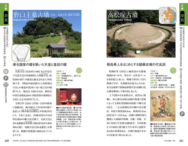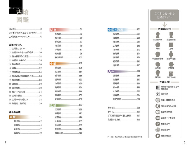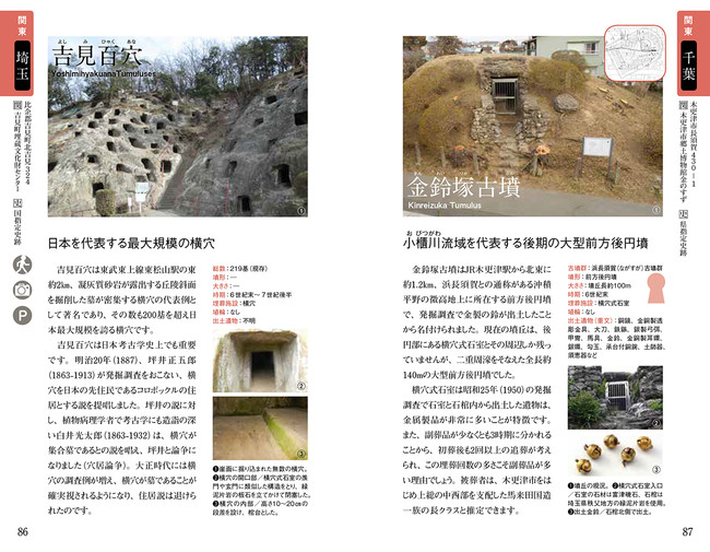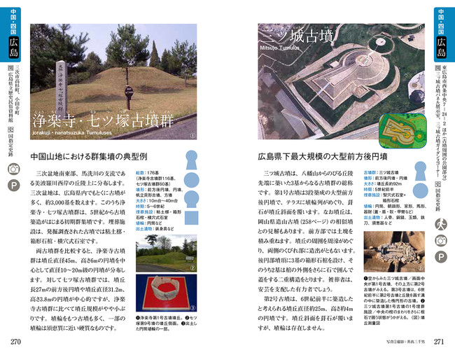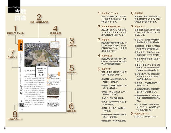 この基準のいずれかに該当する全国256地点、約350基にのぼる古墳や古墳群(横穴を含む)を選定。古墳の大きさや墳丘形状がよくわかる平面図や特色、出土遺物やガイダンス施設の紹介など、現地で見学する際に参考となる解説を掲載しています。「かたち」や「墳丘の立ち入り」「石室見学」「古墳カードの配布」などがひと目でわかるようにアイコン化しました。公開されている映像へリンクできるQRコードも掲載。
