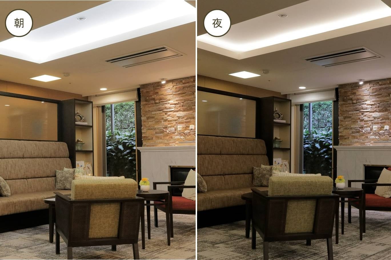 共用部分には、生体リズムを整える照明※6システムを導入し、自然光に近いリズムを再現。また、居室には「睡眠センサー」を導入。“見えない睡眠の状態”をデータ化することで、睡眠の質にまでアプローチしていきます。さらに、夜間も看護・介護スタッフが常駐。テクノロジーの活用と見守り体制で、安心の睡眠をサポートします。