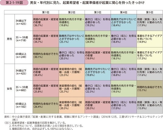 同じく「中小企業白書」からは、「起業希望者・起業準備者が起業に関心を持ったきっかけ」が明らかになっています。きっかけのトップには、「周囲の起業家・経営者の影響」が挙げられており、実際に起業を行った人の話を聞くことによって具体的なイメージがついたり関心が湧いたりしたことで、起業を視野に入れるようになった人が多いことが見て取れます。そのため、起業に興味がある人材に対し起業家・経営者から直接学べる場を提供することが、スタートアップ促進にとって有効であることがわかります。