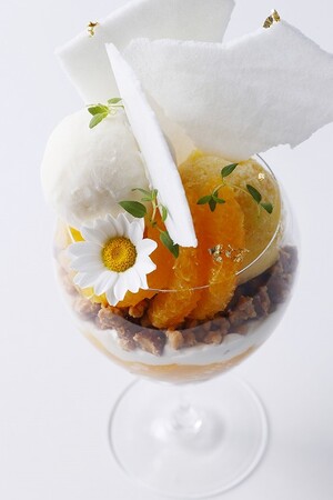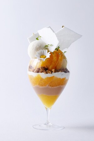 まるで雪景色を思わせるトップ部分の真っ白なメレンゲは、ベルガモットのさわやかな酸味が特徴。その下からはサワークリームのジェラートと金柑のソルベが登場します。コクのあるサワークリームジェラートと、後味にわずかな苦みを感じる金柑のソルベ、そして甘さとジューシーさが際立つフレッシュデコポンとの見事なハーモニーから今月のパフェはスタートします。