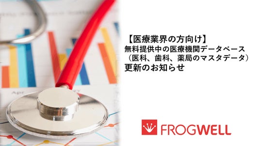フロッグウェル株式会社では、医療機関(病院・クリニック等)・社会福祉施設・医薬/医療機器のメーカー・医薬/医療機器の販売会社の方限定で、医療機関データベースを作成するためのマスタ(医科、歯科、薬局)を無料で提供しております。(上記以外の方には、有料販売となります。)