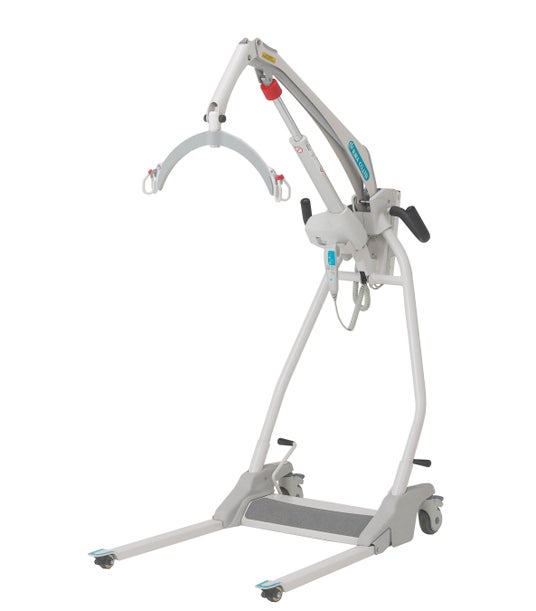 リフト介助の難しさを大きく軽減した移動式リフト。ベース電動開閉、旋回サポート、大きく開いたフレームにより、操作性と安全性を向上させており、床からの吊り上げも可能。