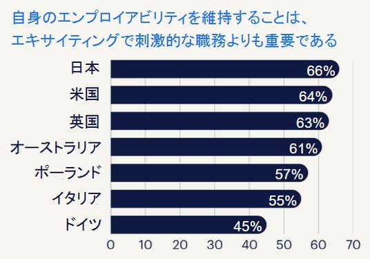 世界の労働者の67%、日本の66%がリモートワークよりもエンプロイアビリティ(企業に雇用され続ける能力や転職市場で活躍できる能力)を優先すると回答しています。また、「自身のエンプロイアビリティを維持することは、エキサイティングで刺激的な職務よりも重要である」と答えた人材の割合は調査国7カ国中、日本が最も多く、66%にのぼりました(世界全体59%)。グローバル経済の不確実性が続く中で、社会で必要とされる能力を高めキャリア形成をしていけるかを重視する姿が浮き彫りになりました。