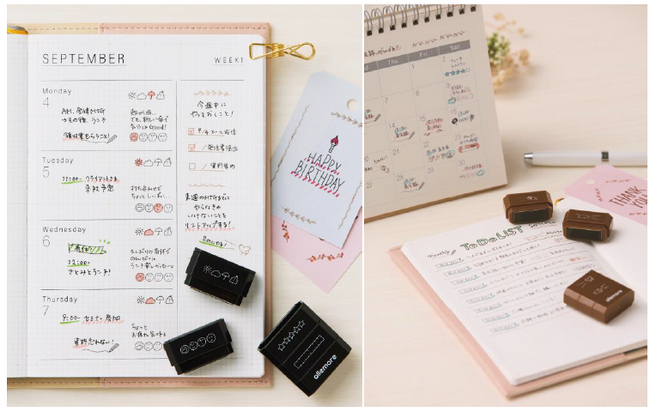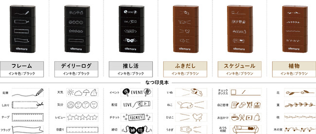 異なる4つの印面を連結させたコンパクトスタンプ。「フレーム」「デイリーログ」「推し活」「ふきだし」「スケジュール」「植物」の6つの異なるテーマをご用意しています。
