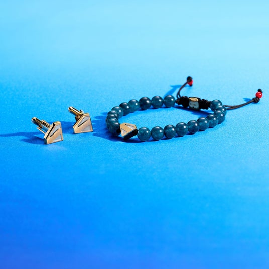 ブルークォーツァイトの半貴石のビーズと、アイコニックな「S」のシールドデザインをあしらったブレスレット。