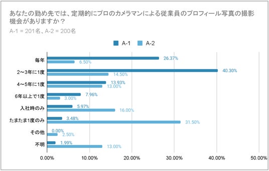 そこで「勤め先でプロカメラマンに自分のプロフィール写真を撮ってもらったことがある」と回答したグループAのうち、「ビジネスチャット等の社内コミュニケーションツール(以下、社内ツール)のアイコンに顔写真を使用している人が多い」と回答したグループ1(201名=A-1)と、「少ない」と回答したグループ2(200名=A-2)で撮影頻度を比較。その結果、グループ1は「毎年」もしくは「2~3年に1度」撮影している人が多く、グループ2は「たまたま1度のみ」が最も多く「入社時のみ」や「不明」も多いことがわかりました。