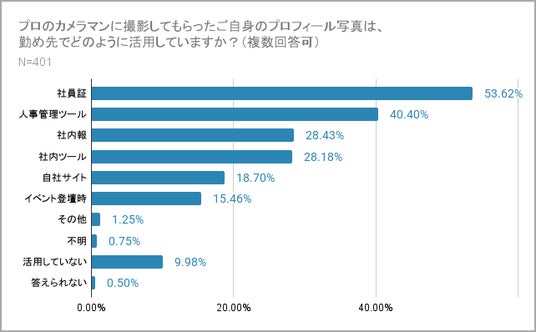 「勤め先でプロカメラマンに自分のプロフィール写真を撮ってもらったことがある」と回答したグループA(401名)に、撮影した写真の活用方法を尋ねたところ「社員証」が53.62%で最も多く、ついで「人事管理ツール(40.40%)」でした。