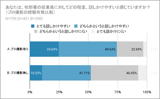 他部署の従業員への話しかけやすさについても尋ねてみたところ、従業員の顔と名前の一致と同様の傾向が見られ、プロカメラマンによる撮影経験があるAグループの方が、プロカメラマンによる撮影経験がないBグループに比べて22.06ポイント多く「話しかけやすい」と回答しています。