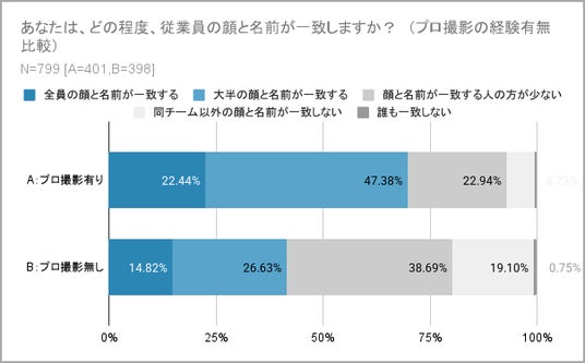 また、プロカメラマンに撮影された経験があるAグループと経験がないBグループとを純粋に比較すると28.37ポイントの差でAグループの方が「顔と名前が一致する」と回答しました。