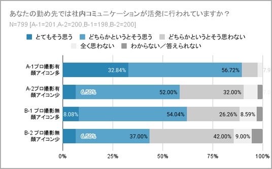・ 顔写真使用の有無で社内コミュニケーション活性に約25ptの差、プロ撮影なら約9割が活性