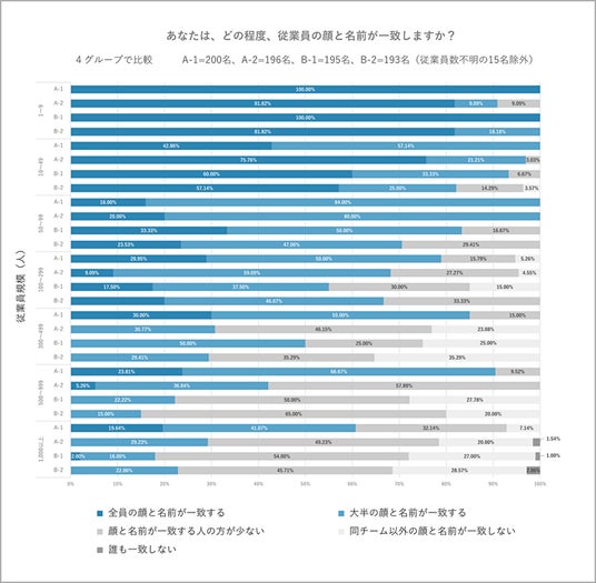しかし、社内コミュニケーション活性は組織規模によっても異なるはずです。そこで、社内コミュニケーションの基礎とも言える「顔と名前の一致」に焦点を絞り、組織規模と各グループごとに比較してみたところ、組織規模に関わらず、プロカメラマンによる撮影経験があり、社内コミュニケーションツール等のアイコンを顔写真にしている人が多いA-1グループが、最も従業員の顔と名前が一致していることがわかりました。むしろ、組織規模が大きくなるほど、顕著にその差が開いています。