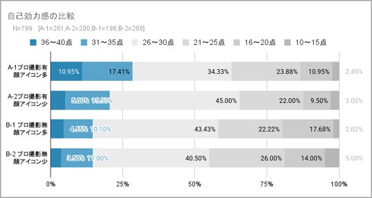 さらに、社内コミュニケーションツール等のアイコンに顔写真を使用している人が多い・少ないでさらにグループ分けしてみると、プロカメラマンに撮影してもらった経験があり、アイコンを顔写真にしている人が多いA-1グループが最も自己効力感が高いことがわかりました。