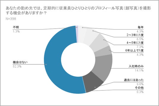一方で、勤め先でプロカメラマンによる撮影経験がないグループB(398人)に、プロカメラマンに限らず、勤め先でプロフィール写真の撮影機会があるかを尋ねたところ「機会がない」が半数を占めました。プロカメラマンによる撮影機会を設けていないと、従業員はプロフィール写真を撮影する機会そのものが乏しいことがわかります。