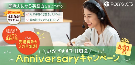 株式会社ポリグロッツ(本社:東京都新宿区、代表取締役:山口隼也)は、2025年5月31日(土)までの期間限定で「11周年記念キャンペーン」を実施いたします。