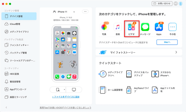 2023年9月9日(土)にAnyTransは「データ管理」機能を更新しました。カメラムービー、インポート/ダウンロードされた動画、ミュージックビデオなどのソースからの動画をサポートしています。