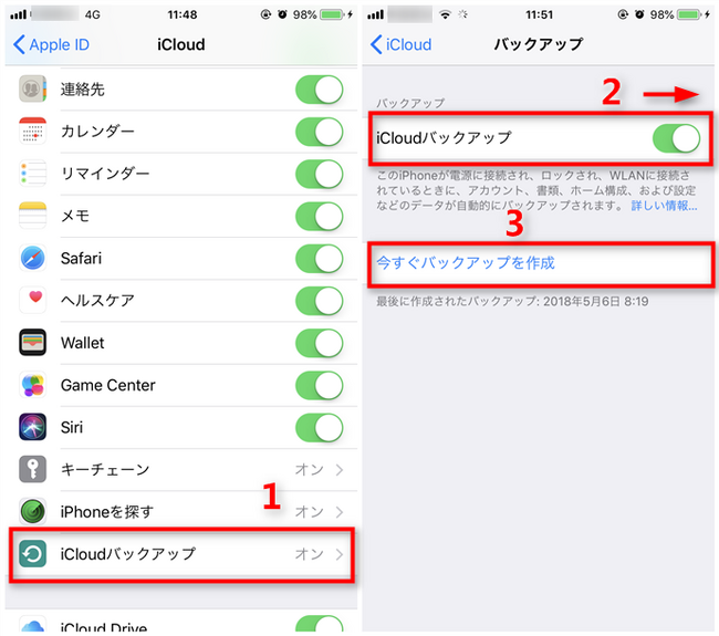 ◾「iCloudバックアップ」をオンにし、「バックアップを作成する」をタップします。