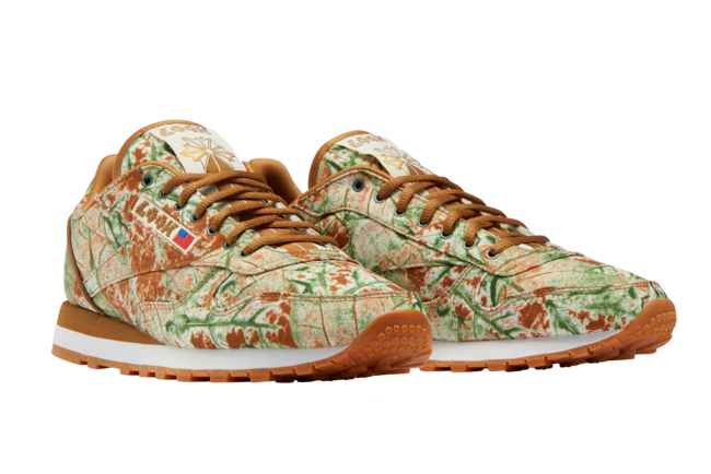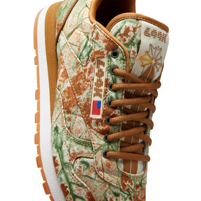 リーフ柄のカモフラージュプリントが満遍なく施された本モデルは、リーボックを形成するストリートカルチャーやアート、ファッションといった深いルーツが、葉脈を辿るように時代を超えて受け継がれ、進化し続けている様子を反映しています。豊かな土壌を表す「バブルガム」カラーと、常に青い葉を茂らす松をイメージした深みのある「パイングリーン」カラーの採用により、細かいプリントデザインでありながらアースカラーのトーンでまとめられた、統一感のあるデザインです。アッパーはテキスタイルアッパー(合成繊維)を使用、シュータンやサイドのウィンドウボックス、ヒール部分には、『LQQK STUDIO』のブランドロゴもあしらわれています。「CLASSIC LEATHER」の定番的なスタイルと斬新なプリントデザインが融合した個性的な一足となっています。