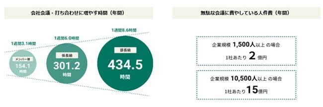 原因のひとつとしては「労働時間の長さ」が挙げられます。中でも会議時間の占める割合は多く、パーソル総合研究所の調査(*2)によると、部長クラスの社員はメンバー層と比較すると、1週間で5.5時間も社内会議の時間が多いことが明らかになっています。さらに約30%の会議を不要と感じていることも判明しています。 これらを人件費で算出すると、企業規模1,500人以上では1社あたり2億円、10,500人以上の会社では年間15億円が不要な会議時間に充てられていることになり、会議の在り方を改めて検討する必要があるといえます。