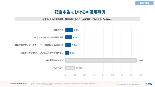 令和6年分の確定申告において、AIを活用した人は14.3%で、AIを活用した実例としては「税金の計算」(7.9%)、「AIチャットボットへの質問・相談」(6.5%)、「銀行明細やクレジットカードデータの自動仕訳」(5.8%)が挙げられました。確定申告にAIを利用した人のうち、90.2%が業務の効率化や情報収集にかかる時間の短縮といった効果を感じています。