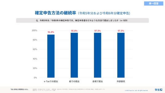 提出方法について、前年と同じ提出方法を今年も予定している事業者が多くを占めました。令和5年分の確定申告提出方法と令和6年分の提出方法の予定について、「両年ともe-Taxで提出する予定」と回答した人は91.0%、「両年とも紙で提出する※」と回答した人は95.8%となり、提出方法は個人ごとに固定化する傾向が見られます。
