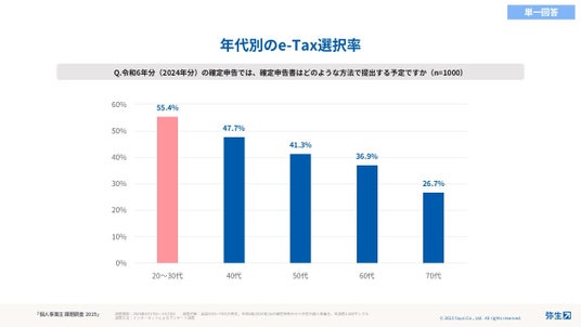 ・年代別のe-Tax選択率では、20~30代が55.4%と最多。最も少ない70代以上でも26.7%がe-Taxを選択