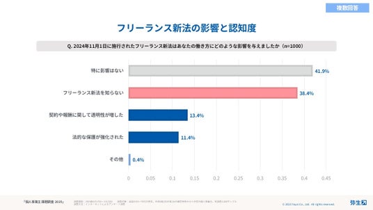 ・2024年11月施行の「フリーランス新法」について、19.7%が前向きな効果を実感するも、38.4%は「法律について知らない」と回答