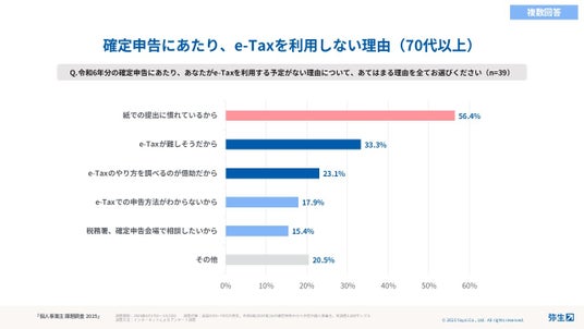 70代以上の方がe-Taxを選択しない理由については、「e-Taxが難しそうだから」(33.3%)、「e-Taxのやり方を調べるのが億劫だから」(23.1%)が並び、電子申告の浸透には、全年代が利用しやすいシステムやサポート体制の整備が課題となりそうです。
