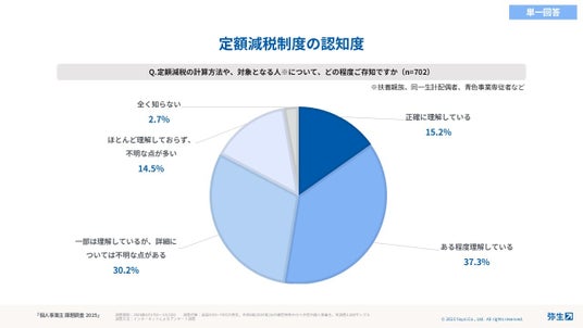 令和6年度税制改正に伴い、令和6年分(2024年分)の所得税について定額による所得税額の特別控除(定額減税)が実施されることとなりました。個人事業主がこの定額減税を受けるには、確定申告が必要となることは70.2%の事業者が把握していました。しかし、そのうち47.4%は実際の定額減税の計算方法や、対象者などの制度を受けるための詳細について「不明な点がある」「ほとんど理解しておらず、不明な点が多い」「全く知らない」と回答しました。