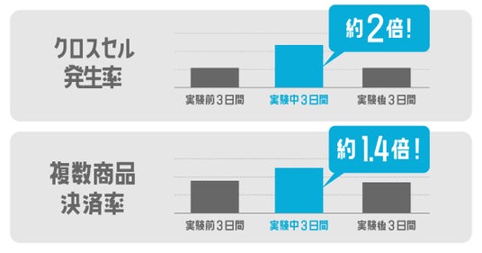 単に複数商品が含まれているだけではなく、「お弁当とお茶」などクロスセルと考えられる決済(目視確認)を抜き出して比較したところ、このクロスセル発生率は期間中2倍以上に向上しました。
