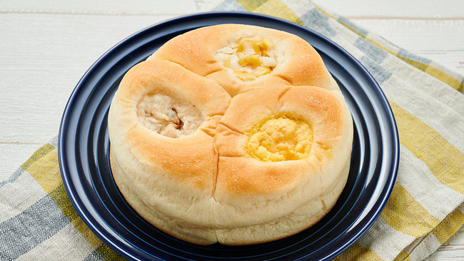 ふんわりとしたパン生地に、タマゴ、ツナ、コーンマヨをトッピングしました。3種の味が一度に楽しめる惣菜パンです。