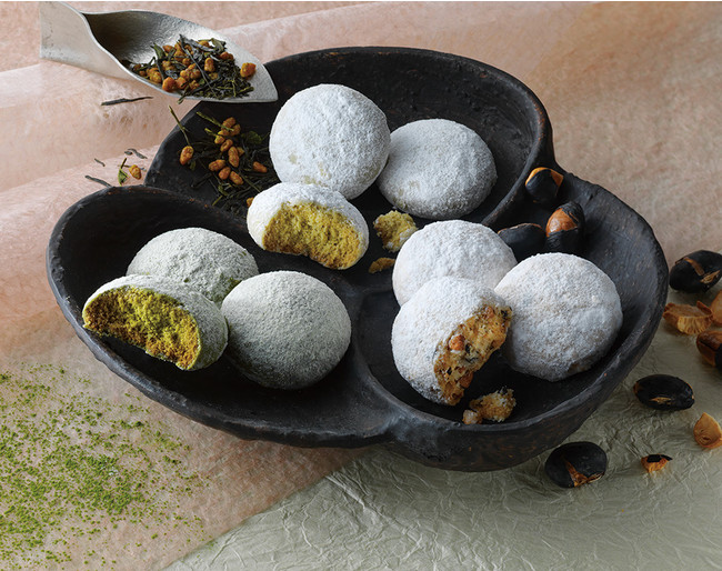 [玄米茶]…京都製造の玄米茶を生地に練り込み、仕上げに粉糖をまぶしました。香ばしく、まろやかで甘みのある玄米茶の味わいがしっかりと感じられます。